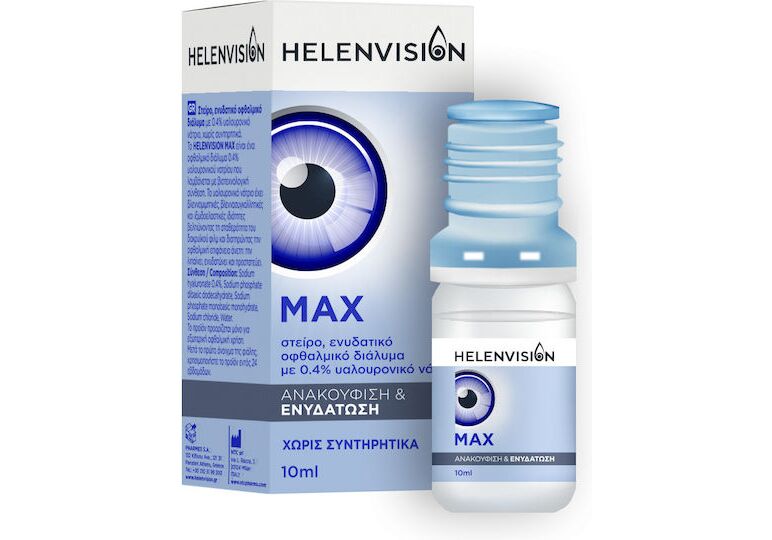 Το Helenvision Max είναι ένα στείρο, ενυδατικό οφθαλμικό διάλυμα με 0.4% υαλουρονικό νάτριο.