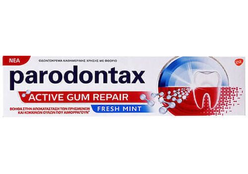 Η Parodontax Advance Active Gum Repair Fresh Mint είναι μια φθοριούχος οδοντόκρεμα καθημερινής χρήσης, κατάλληλη για την αποκατάσταση των ούλων που αιμορραγούν ενώ απομακρύνει τη βακτηριακή πλάκα που συσσωρεύεται κατά μήκος της γραμμής των ούλων.
