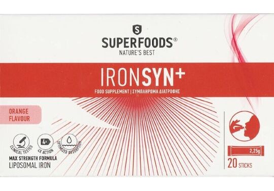 Superfoods Ironsyn+, Συμπλήρωμα Διατροφής Λιποσωμιακού Σιδήρου, Βιταμινών & Προβιοτικών για την Αντιμετώπιση της Σιδηροπενίας Κατά της Κούρασης & Κόπωσης με Γεύση Πορτοκάλι 20Sticks