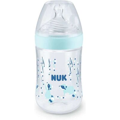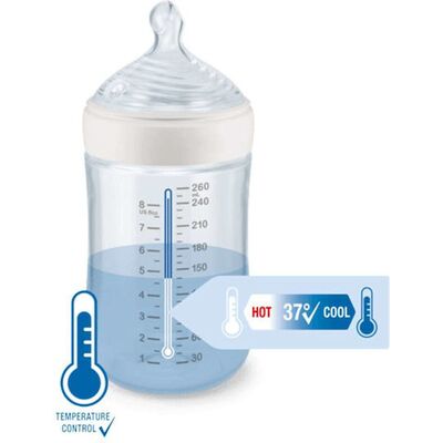 NUK Nature Sense Μπιμπερό με Δείκτη Ελέγχου Θερμοκρασίας, 260ml. Διαθέτει θηλή σιλικόνης σχεδιασμένη να προσομοιάζει στη θηλή της μητέρας, με μέγεθος Μ (6 μικροσκοπικές οπές για φόρμουλα γάλακτος). Κατάλληλο για ηλικίες 6-18 μηνών και δεν περιέχει δισφαινόλη (BPA). Κάθε μπιμπερό πωλείται ανά συσκευασία.
