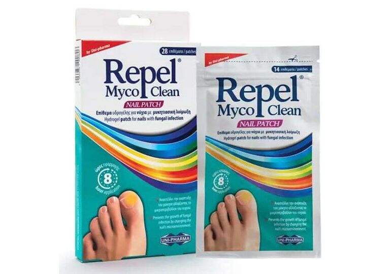Το επίθεμα υδρογέλης για τα νύχια Repel® Myco Clean NAIL PATCH προσφέρει συνεχή ενυδατική δράση, βελτιώνει την όψη των αποχρωματισμένων και παραμορφωμένων νυχιών, λειαίνει απαλά την εξωτερική επιφάνεια των νυχιών και αλλάζει το μικροπεριβάλλον του νυχιού αποτρέποντας με τον τρόπο αυτόν την ανάπτυξη μυκητιασικών λοιμώξεων.