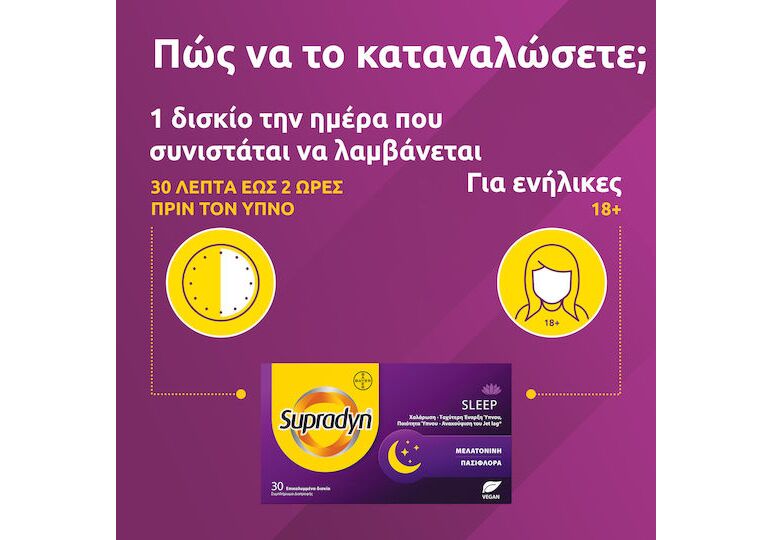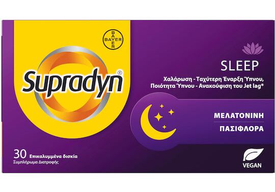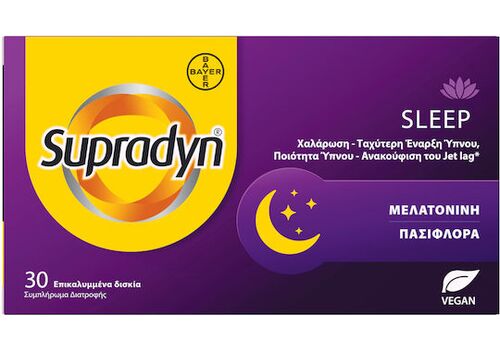 Το Supradyn® Sleep είναι ένα συμπλήρωμα διατροφής, σχεδιασμένο ειδικά για να σας χαρίσει τον ύπνο που αξίζετε. Περιέχει μελατονίνη σε συνδυασμό με πασιφλόρα και μπορεί να σας βοηθήσει στο να αποκοιμηθείτε πιο γρήγορα καθώς και να διατηρήσετε καλής ποιότητας ύπνο. Έτσι θα ξυπνήσετε αναζωογονημένοι, χωρίς την αίσθηση υπνηλίας την επόμενη μέρα.