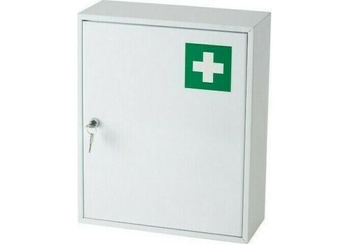 Φαρμακείο τοίχου μεταλλικό διαστάσεων 38cm x 29cm x 12cm, σε λευκό χρώμα με κλειδαριά και δυο ράφια για τοποθέτηση αντικειμένων.