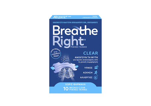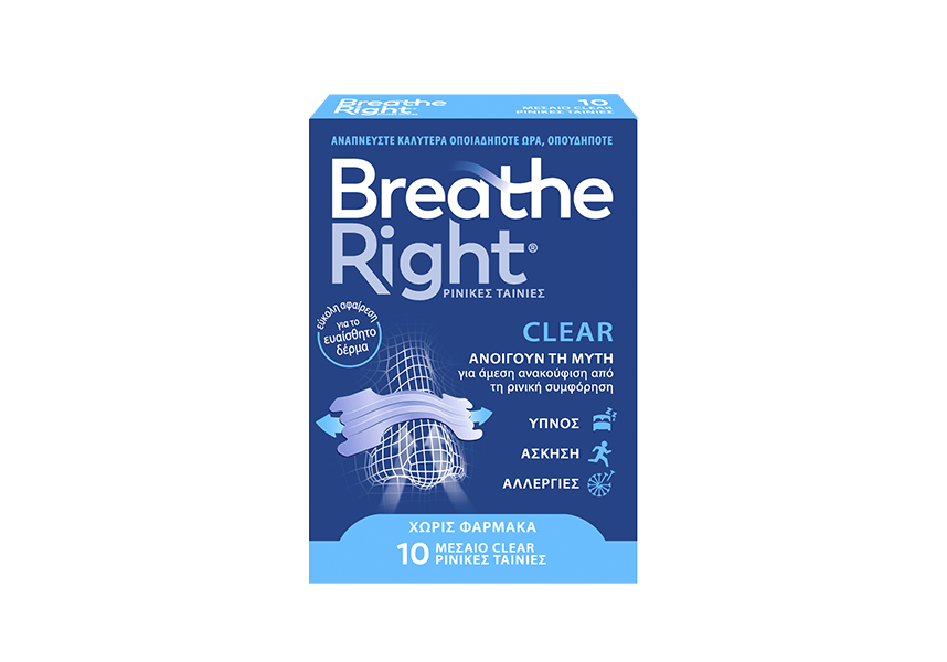 Οι Ρινικές Ταινίες Breathe Right® Clear είναι διαθέσιμες στο Μεσαίο Μέγεθος και σε συσκευασία των 10 ταινιών.