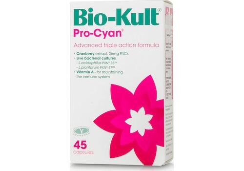 ΤοBio-Kult®Pro-Cyan®είναι συμπλήρωμα διατροφής με φόρμουλα τριπλής δράσης, επιστημονικά τεκμηριωμένη, με εκχύλισμα Cranberry [36mg (A-type PACs)*] το οποίο δρα παρεμποδίζοντας την ικανότητα του E.coli να προσκολλάται στα τοιχώματα των βλεννογόνων, δύο προβιοτικές αλυσίδες Protexin (1,2 δις ανά γρ) επιλεγμένες ειδικά για την αντιμικροβιακή δράση τους κατά του E.coli και Enterococcus Faecalis και βιταμίνη Α (320 IU) για την ενίσχυση και προστασία του επιθηλίου του βλεννογόνου της ουροφόρας οδού και τη διατήρηση της ισορροπίας των Lactobacillus, καθώς και την ενίσχυση του ανοσοποιητικού.
