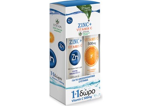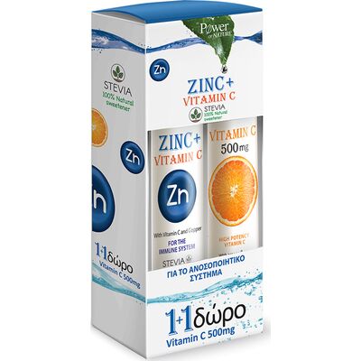 Πακέτο προσφοράς με Zinc & Vitamin C με Στέβια 20 αναβράζοντα δισκία και Vitamin C 500mg 20 αναβράζοντα δισκία που προσφέρει τόνωση και ενέργεια, ενώ συμβάλλει στην ενίσχυση του ανοσοποιητικού συστήματος σε περιόδους στρες ή και κρυολογήματος.
