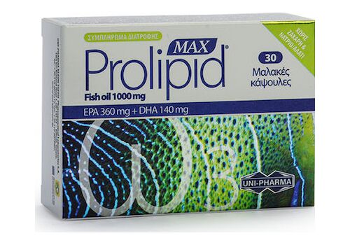 To Prolipid Max τηςUni-Pharma είναι ένα συμπλήρωμα διατροφής του οποίου η εξειδικευμένη σύνθεση, με Ω3 πολυακόρεστα λιπαρά οξέα συμβάλλει στην καλή λειτουργία της καρδιάς. Το EPA (εικοσαπενταενοϊκό οξύ) και το DHA (εικοσιδυαεξανοϊκό οξύ) συμβάλλουν στη φυσιολογική λειτουργία καρδιάς. Τα ευεγερτικά αποτελέσματα εξασφαλίζονται με την ημερήσια πρόσληψη 250mg EPA και DHA.