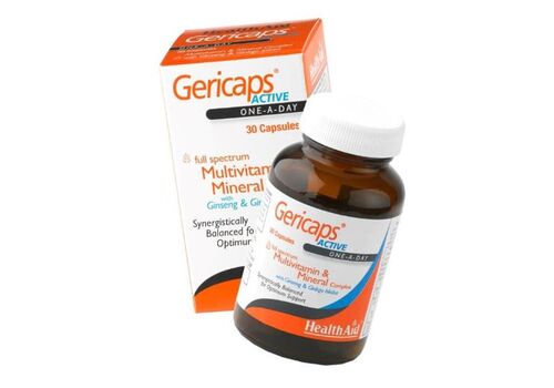 Ισορροπημένο και υψηλής απόδοσης σύμπλεγμα πολυβιταμινών, μετάλλων και ιχνοστοιχείων μαζί με ginseng & ginkgo biloba. Η ειδικά επιλεγμένη σύνθεση του Gericaps Active και οι πατενταρισμένες τεχνικές παραγωγής της HealthAid, εξασφαλίζουν την γρήγορη απορρόφηση & την πλήρη αφομοίωση των συστατικών από τον οργανισμό.